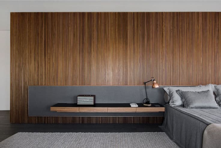 Nos quartos, o painel ripado pode ser usado para criar uma cabeceira moderna e sofisticada. Instalar o painel na parede atrás da cama traz uma sensação de conforto e profundidade, além de dar um toque de personalização ao ambiente. A madeira ou o MDF são materiais especialmente indicados para essa área, pois adicionam uma sensação de calor e aconchego, essenciais em um ambiente de descanso.