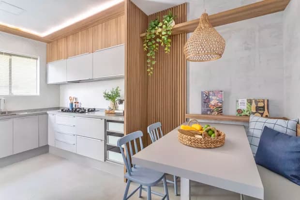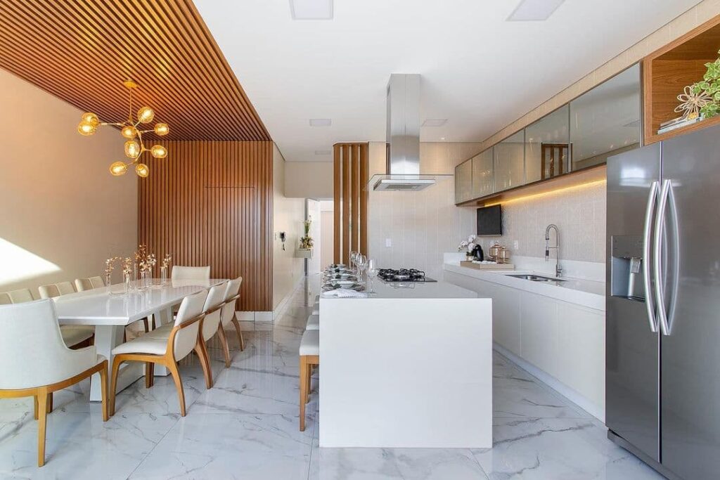 Por fim, os painéis ripados podem ser aplicados em armários e prateleiras, trazendo um toque moderno e natural para o ambiente. A combinação entre painéis ripados e armários lisos, por exemplo, cria um contraste interessante, ao mesmo tempo em que mantém a praticidade necessária na cozinha. Isso permite que o espaço tenha uma estética sofisticada sem abrir mão da funcionalidade.