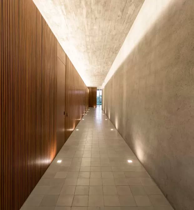 Outra possibilidade é o uso de iluminação embutida entre as ripas, destacando ainda mais o design e criando um efeito visual interessante à noite. Esse detalhe transforma o corredor em um espaço mais acolhedor e elegante, sem a necessidade de grandes intervenções.