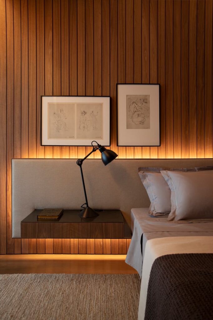Além das cabeceiras e nichos, o painel ripado pode ser usado para revestir paredes completas ou até mesmo tetos, dando continuidade ao design e criando um ambiente mais harmônico. A integração com a iluminação, seja por meio de fitas de LED ou luminárias embutidas, acrescenta um toque moderno e dinâmico ao quarto, valorizando ainda mais o espaço.